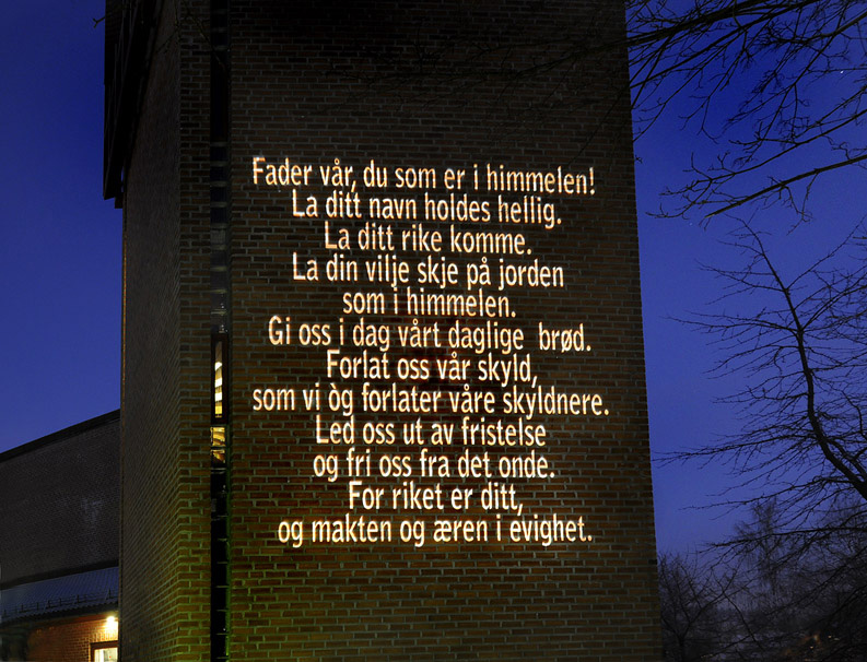 - Slik innleder biskop Cyprian (ca. 200-258) tanker om Fader vår - Herrens Bønn Ordene på denne nettsiden kan bringe noe nytt inn i denne bønnetekst; for løsning på et meget stort, og merkelig underkommunisert problem fra de "lærde" i meget lang tid; "elefanten i teologiens rom"; som ser ut til å ha vært der fra første utgave på koinégresk (mellom gammelgresk og moderne gresk) fra tidligste tid. Dette ser ut til ha bidratt til å ha øket avstanden mellom "folket" og de lærde. Lysteksten du ser på bildet ble satt opp med en projektor mot tårnveggen til Helgerud kirke i 2008 forbindelse med en konsert. Nederst ved veien forbi kirken var teksten delvis skjult av trær, men fremkom mer og mer klart og stor (den var ca. 4m bred) når man gikk gangveien oppover mot kirken. Når man kom innpå, kunne teksten forandre seg sterkt i opplevelse: Det viste virkningen av evangeliets ord også ellers; når man kommer nær ordene blir de meget sterkere! I Bønnen har de troende hentet styrke og visdom i snart 2000 år. Bønnen er et samlingspunkt i kirkens gudstjenester. Den har vært en viktig del av vårt lands kulturgrunnlag, kjent for de fleste - troende eller mindre troende. Med sitt universelle innhold kan den brukes i en stor variasjon av "åndelige ståsteder" - eller gåsteder... I Bønnen var Jesu lære i "fortettet form" for de troende. Den var bare kjent for de døpte den gang i "urkristendommen"; det som den gang het "Veien"; "bevegelsen" etter Jesus, før det ble til "kristendom". "Veien" er først nevnt i "Paulus' forsvarstale for folket" (Apg 22;4), også rett etter for rådet. Dåpen var en "troendes dåp" for de som ville være etterfølgere av Jesus og som en mektig, bevissthetsutvidende opplevelse; med dagers faste i forkant. Deretter fikk man Bønnen med seg på Veien videre. Bønnen består av vakre, dype ord, til en livslang mulighet for stadig nye virkende erfaringer av ordene. Den begynner med en innledende tiltale til Gud, etterfølges av en 7-delt bønnedel (6-delt er også brukt med 6.- og 7. Bønnen som en bønn). Lovprisningsdelen til slutt er lagt til senere, og sees skriftlig første gang i Didacheen fra antagelig rundt 100-tallet, der det anbefales å be Bønnen 3 ganger daglig. En arameisk første utgave av Evangeliet etter Matteus kan være en første skriftlig kilde med bønnen. Det er forøvrig ikke funnet noe eget arameisk eller gresk navn på bønnen. - Men så: Den merkelige uforståeligheten med Herrens Bønn - i den 6. Bønnen der temaet er noe av den største viktighet for mennesker å hanskes med i livet ; "fristelse". Grunnteksten kan direkte i en såkalt konkordant (ord-for-ord) oversettelse skrives (Wikipedia: "Fadervår"): "Og ikke (inn-) før oss inn i fristelse (prøvelse)". Samme ord for "fristelse" og "prøvelse" både på gresk og hebraisk. I grunnteksten er det brukt et ord for fristelse (med latinske bokstaver); "peirasmos". Det kan ha flere betydninger på gresk, men uansett er det en uforståelig teologi med at Gud bes om å "ikke gjøre". Det er særdeles vanskelig å tenke seg, når Gud alltid gjør det gode! Det vi i ordene skal be Gud ikke gjøre er det meget viktige Gud kan gjøre for oss - kjernen i det å være i kontakt med Gud; lede oss! "Led oss ikke" er derfor noe helt spesielt dårlig å be om til Gud! Den vanligste tolkningen av ordet "peirasmos"er "fristelse", og det skal samsvare med hvordan ordet er brukt ellers i tekstene. Derfor blir det også ekstra dårlig teologi nå vi ber Gud: "ikke (inn-) før oss i fristelse", dvs. ikke gjør det onde mot oss! " Bare "fristeren" ellers i Bibelen, og mennesker mot seg selv, og mot hverandre, kan knyttes til dette. Jeg tror at utviklingen i tenkning rundt fristelsens mange komplekse sider ble forstyrret av den meningsløse utgave av 6. Bønnen. De troende har ikke kunnet gå dypere inn i ordene, slik man kan med resten av ordene i Bønnen. «Led oss ikke» ble bedt og bedt - og ble "sittende i ryggmargen» - og hvilken virkning kan det ha hatt på et menneskesinn i alle disse årene? Det kan fatalt ha forstyrret meget viktig teologisk og annen tenkning om fristelse i alle dens former og Guds nødvendige hjelp i dette. - Det kan vises at alle bønneleddene i utgangspunktet er satt sammen av deler fra jødiske bønner på den tiden. Slike bønner kunne også formes slik at en "forsterket meningen" i først å takke for eller bekrefte hva Gud ikke gjør, og i sammenheng be om det Gud kunne sies å gjøre. En jødisk morgenbønn er slik oversatt til norsk av rabbiner Joav Melchior: