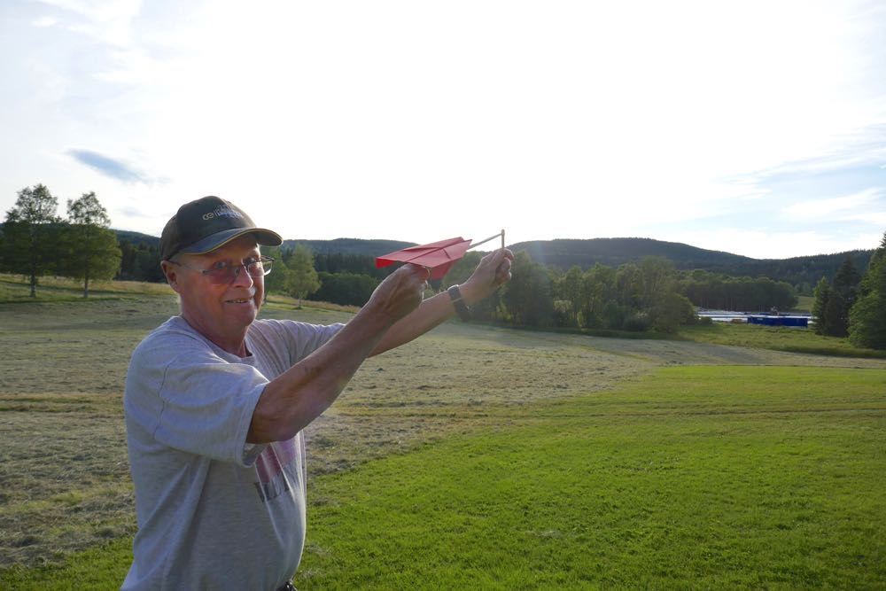 seilfly med 1m vingespenn, for hangflyvning. Hangflyvning benytter oppdriften når vinden ledes opp av terrenget. Her er konstruktøren av det første flyet; Torbjørn Amundsen. |